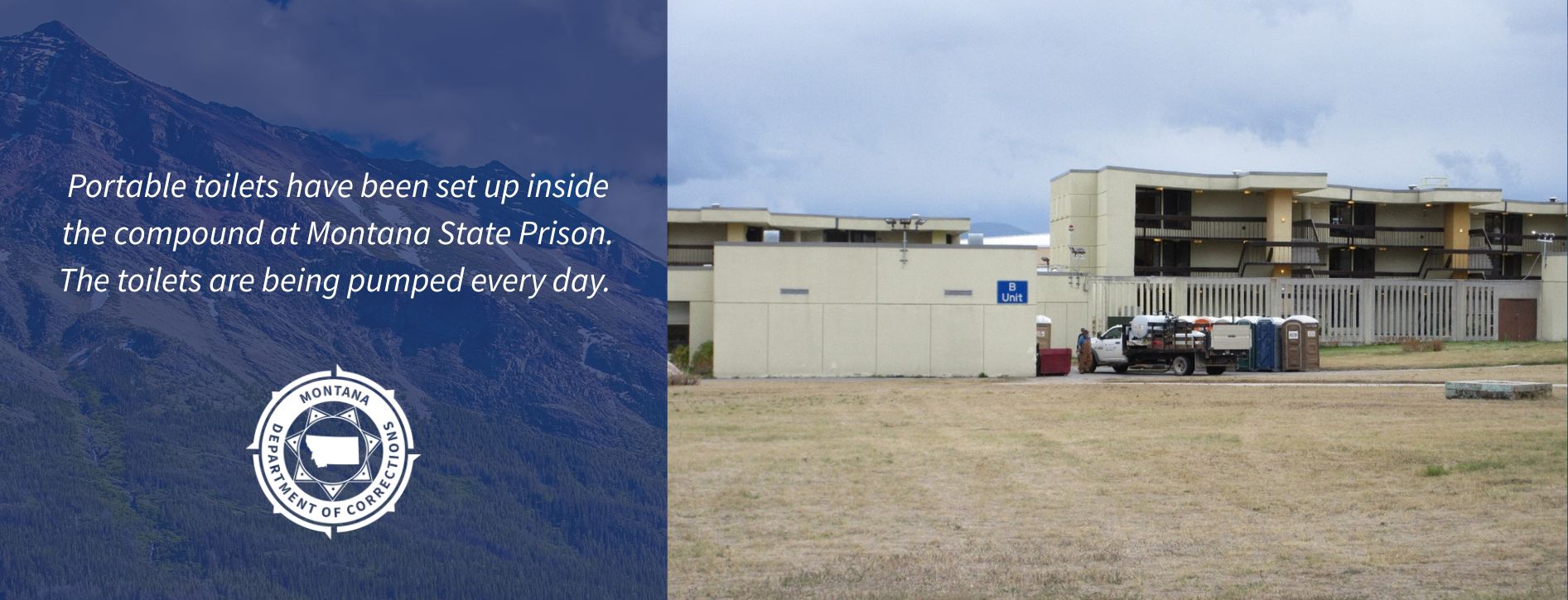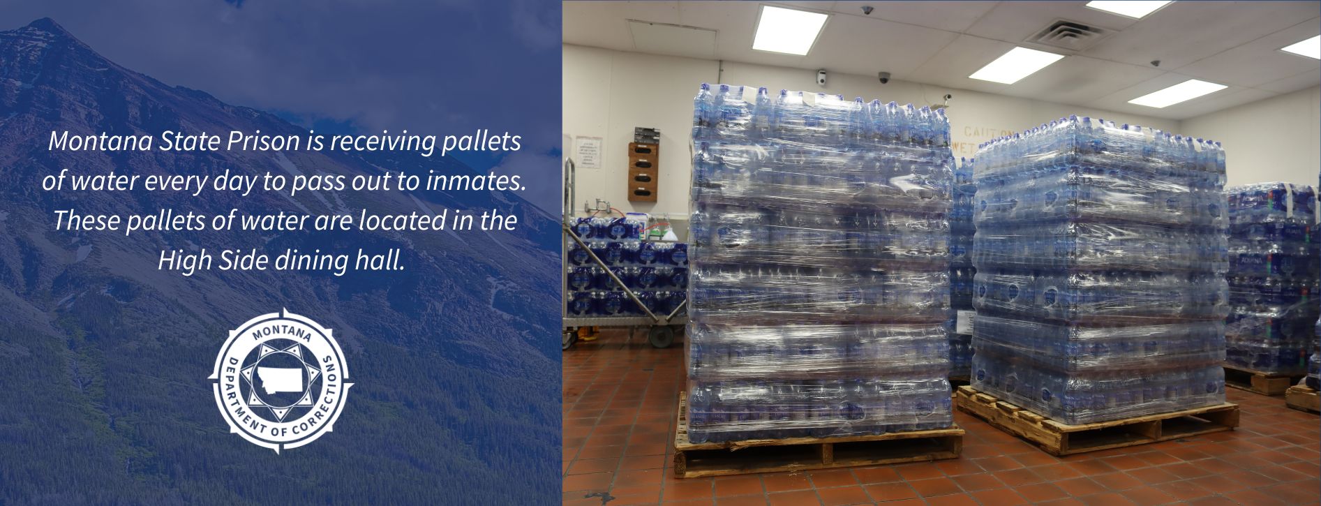 Inmates will be provided with water bottles and regular services, like meals, have not been affected. Inmates have not been relocated due to the water pipe break. The department is working with Montana Disaster Emergency Services to get 15,000 gallons of water to the main water tank.